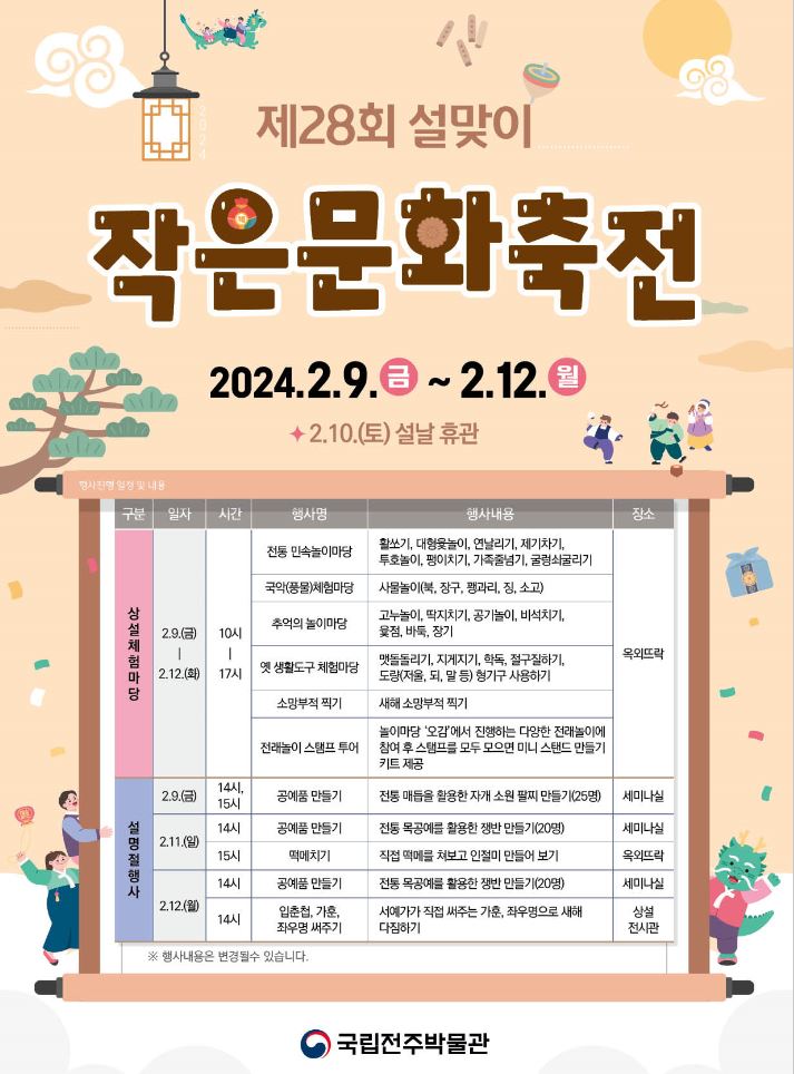 내용:  2024년 푸른용의 해 갑진년을 맞이하여 국립전주박물관에서 실시하는 축제, 전통민속놀이마당, 국악체험, 추억놀이 및 옛 생활 도구 체험 마당 등 다양한 체험.