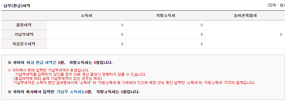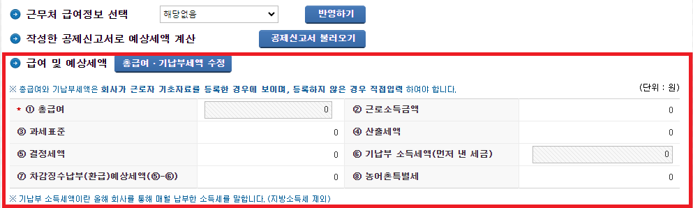 회사가 근로자의 기초자료를 미리 등록할 경우 바로 확이할 수 있지만 대게 입력되지 않는 경우가 많습니다. 그 경우 총 급여 기납부세액 수정 버튼을 클릭하여 지난해 총 급여액과 기납부세액을 기재합니다. 수정된 내용을 작성 후 나머지 항목들이 자동계산되어 '차감징수납부예상세액'에서 연말정산환급금을 받을 수 있습니다.