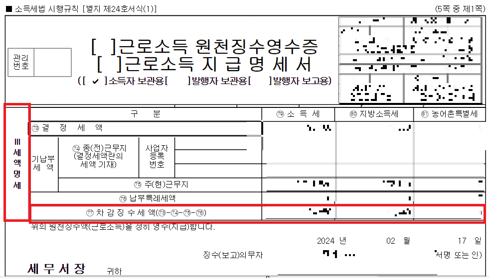 발급박은 근로소득 원천징수영수증의 최하단에 77번 차감징수세액란이 바로 환급금내역입니다. 차감징수세액 금액이 마이너스(-)금액일 경우, 환급을 받을 수 있으며, 플러스(+) 금액일 경우, 아쉽지만 세금을 납부해야 합니다.