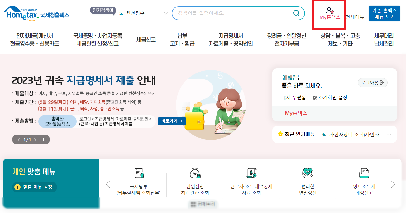 ① 홈택스 홈페이지 로그인 - [MY홈택스] 클릭