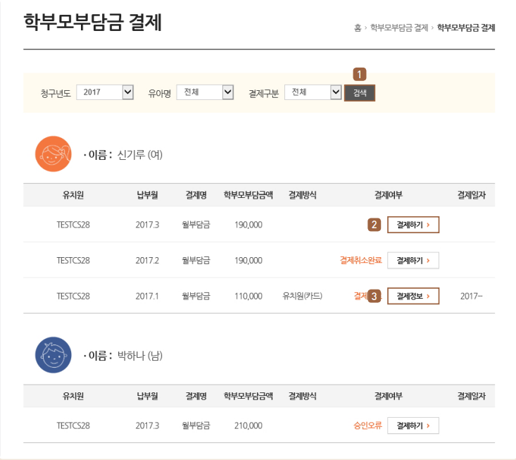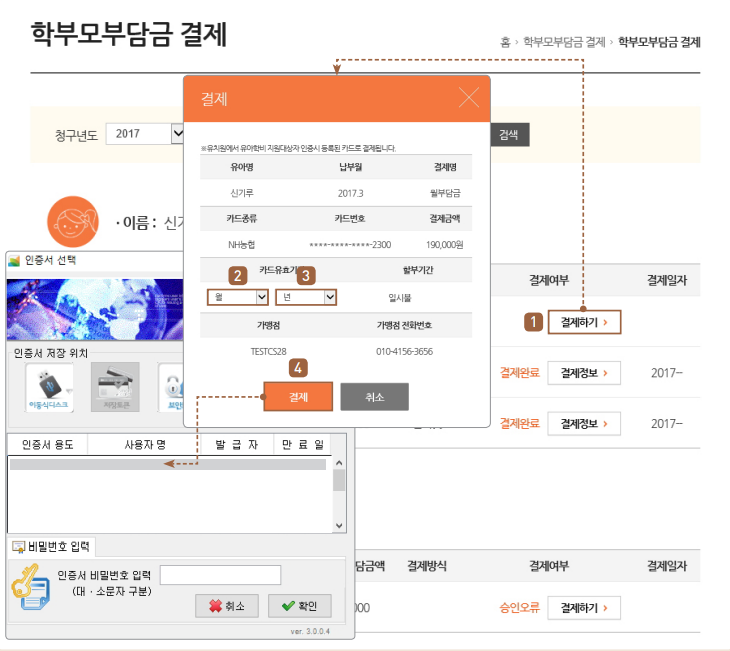 홈페이지에 접속하여 로그인 후 메인화면에서 [학부모부담금 결제] 를 클릭합니다.새 화면에서 청구년도와 유아명 및 결제 구분을 선택 후 조회합니다.이후 [결제하기]를 클릭하면 결제 팝업 창이 나타납니다. 팝업창이 뜨면 카드유효기간 월과 년도를 선택하여 [결제] 하고, 공인인증서 인증 후 결제를 완료할 수 있습니다.