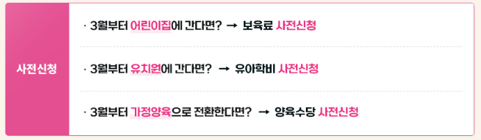 2024년 3월부터 교육기관이 변경될 경우 보육서비스의 사전신청할 수 있습니다. 즉, 자녀가 이용하는 교육기관이 어린이집일 경우 보육료를, 유치원 입학을 앞둔 경우 유아학비를, 가정양육으로 전환할 경우 양육수당으로 사전 신청할 수 있습니다. 2024년 사전신청은 2024년 2월 5일 (월) 8시부터 2024년 2월 29일 (목) 16시까지 가능합니다.