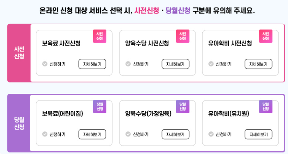 또한 온라인 신청할 경우, 사전신청과 당월신청을 구분하고, 내가 신청하는 영유아 보육서비스가 무엇인지 확인한 후 신청해야 합니다.