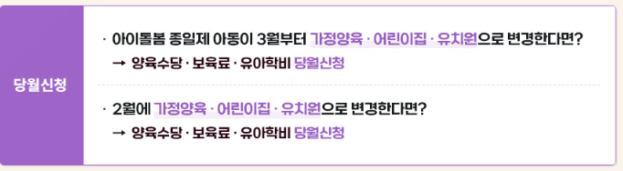 2월에 교육기관을 변경하거나 이전에 아이돌봄 종일제를 지원받았던 아동이 3월부터 가정양육으로 전환하거나 어린이집 또는 유치원에 입학할 경우 보육서비스를 당월 신청해야합니다.