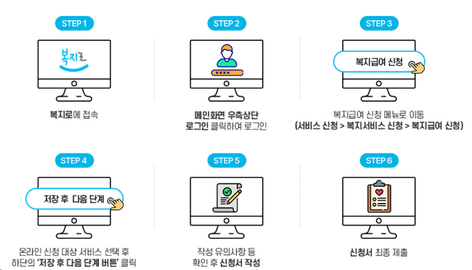 온라인으로 신청할경우, 복지로 누리집홈페이지나 복지로 모바일앱에서 진행할 수 있습니다.
