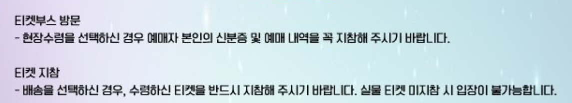 티켓을 현장수령할 경우, 티켓부스에 방문하여 예매자 본인의 신분증및 예매내역을 지참하셔야 합니다. 신분증은 주민등록증, 운전면허증, 여권, 청소년증, 사진 및 생년월일이 표기된 학생증, 외국인 등록증 등 본인확인이 가능해야 합니다. 한 사람이 여러 장의 티켓을 예매한 경우, 모든 동반인은 예매자와 함께 입장해야 합니다.티켓을 사전에 우편으로 수령한 경우, 실물 티켓을 소지하여야 입장이 가능합니다.