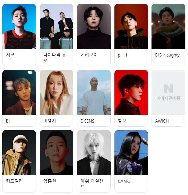 - 지코, 다이나믹듀오, 기리보이, PH-1, BIG NAUGHTY, B.I, E SENS, AWICH, CAMO,이영지, 창모, 키드밀리, 양홍원, 애쉬 아일랜드