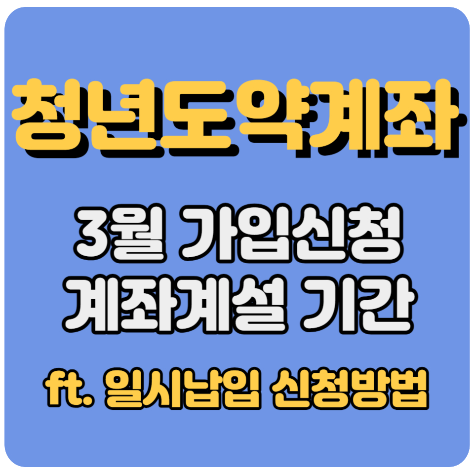 청년도약계좌란 만 18세 ~ 34세의 청년들의 여유 자금 마련을 돕기 위한 상품입니다. 청년도약계좌는 일반 적금보다 높은 금리, 비과세 혜택과 최대 6% 정부 추가 기여금지원까지 지원받을 수 있습니다. 청년도약계좌는 2월 신청이 마감 후 3월 청년도약계좌 가입신청이 진행 중입니다. 오늘은 3월 청년도약계좌 가입신청일과, 2월에 청년도약계좌에 가입한 경우 계좌계설 가능 기간 등 가입 조건 알아보겠습니다.
