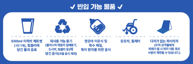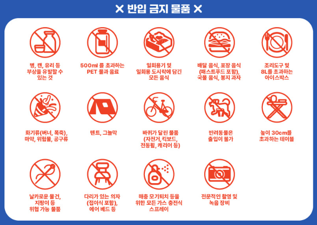 - 반입 가능 물품: 500ML이하의 패트병 음료(1인1개) 또는 텀블러, 재사용 가능한 용기, 영유아 이유식 및 음식, 유모차, 휠체어, 다리가 없는 좌식의자, 돗자리