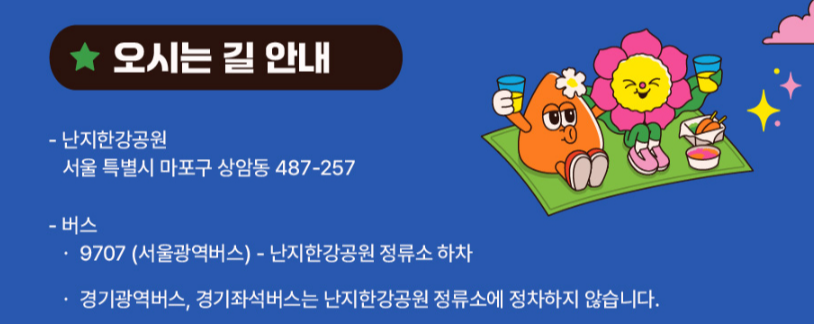 - 페스티벌은 비지정 공연으로 스탠딩존, 피크닉존, 포토존, 먹거리존을 자유롭개 이동하며 관람 가능