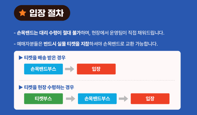 - 손목밴드 수령 후, 게이트 오픈하여 선착순 입장 가능