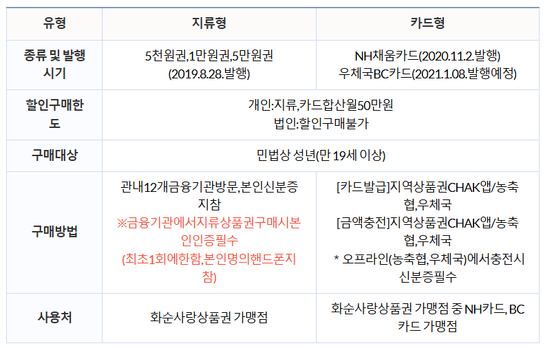 화순사랑상품권은 5천원, 1만 원, 5만 원권 3가지 종이지류형과 계좌 연결 카드형 두 가지 종류가 있습니다. 지류형과 카드형 모두 합산하여 1인당 월 50만 원까지 구입할 수 있습니다. 화순사랑상품권은 10% 범위 내에서 할인받아 구입할 수 있으며 탄력적으로 운영됩니다.