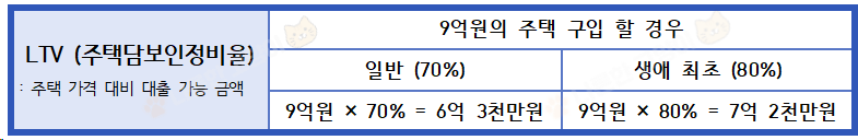 9억원의 주택을 구입하려는 경우,  LTV 70%, 생애 최초 주택일 경우 80% 일 때, 대출가능 금액은 다음과 같이 계산할 수 있습니다.