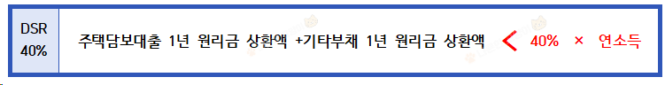 즉, 개인의 모든 대출에 대하여 1년동안 원금과 이자를 상환하는 금액이 나의 연소득의 40% 이하여야 한다는 것입니다.