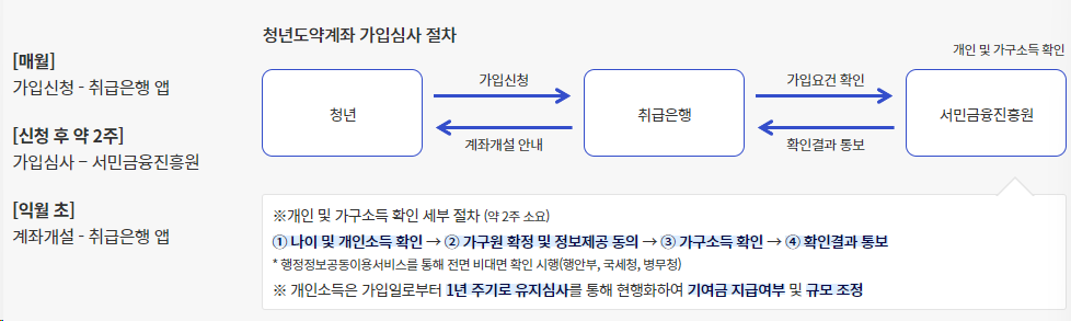청년도약계좌는 신청 후 심사의 과정을 거쳐 가입이 가능합니다. 심사는 약 2주정도 소요되니 참고하시기 바랍니다.