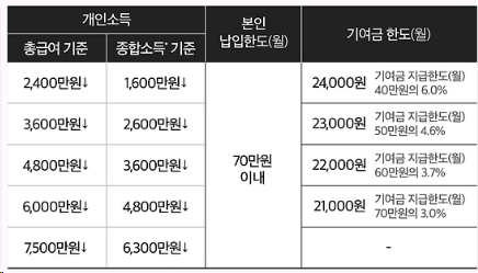 개인의 총급여 기준과 종합소득 기준에 따라 기여금의 한도도 변경되니 자세한 내용은 청년도약계좌 신청 시 확인해야합니다. 청년도약계좌를 신청하기 직전 과세기간의 소득이 확정되지 않은 기간에 소득을 확인한 경우 전전년도 소득으로 인정되니 참고하시기 바랍니다.