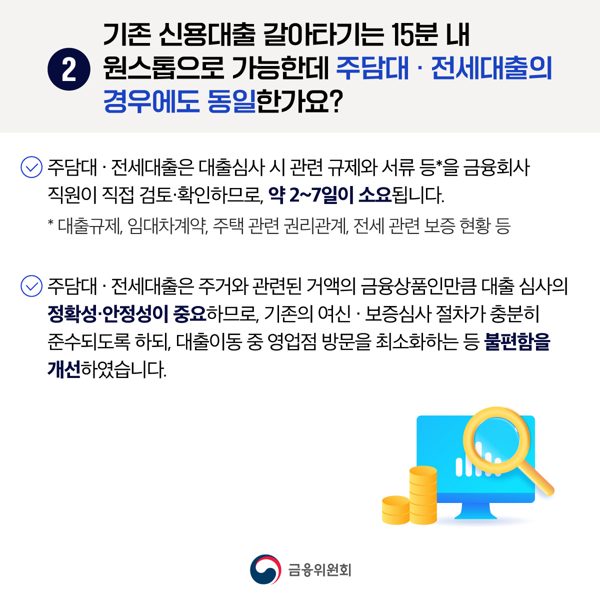 ▶ 주담대 및 전세대출은 대출심사 시 관련 규제와 서류 등을 금융회사에서 직접 검토와 확인의 과정을 거처야해서 약 3~7일 소요됩니다.